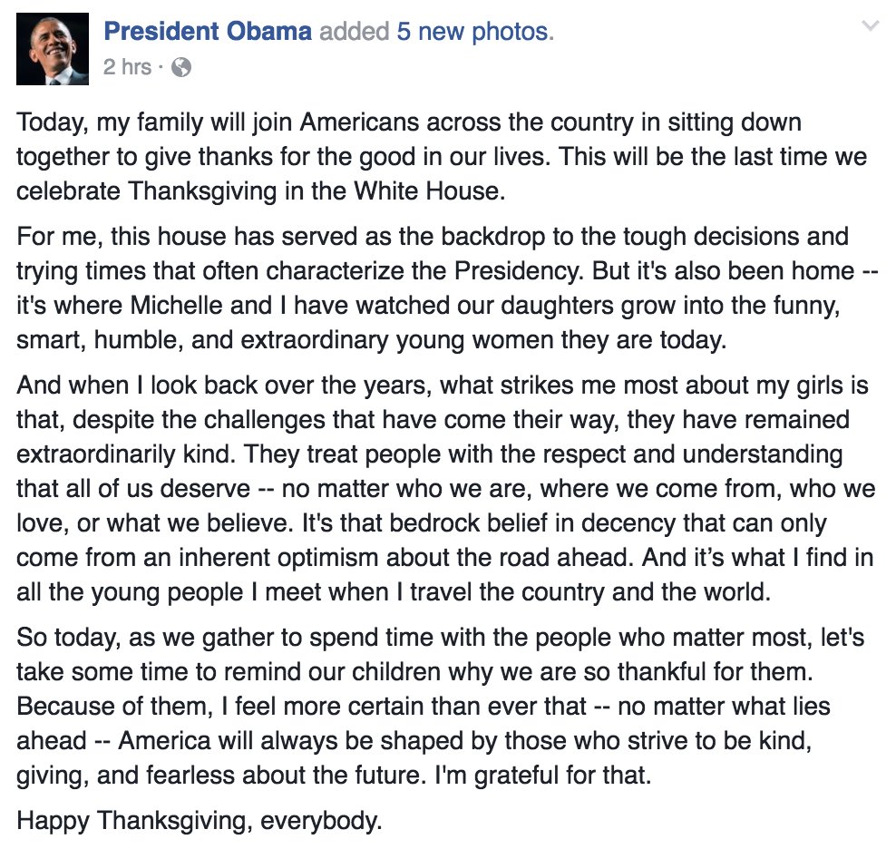 President Barack Obama a few hours ago posted this message below to his fellow Americans to mark the occasion of this year's thanksgiving celebration, which is usually seen in some quarters as American Christmas. In fact, more people in the US celebrate Thanksgiving than they do Christmas.