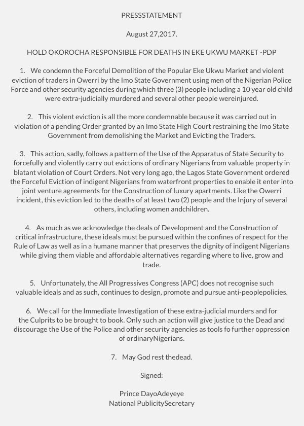 The Peoples Democratic Party Issues A Statement On The Killing During The Forceful Demolition Of Ekeukwu Owerri Market!