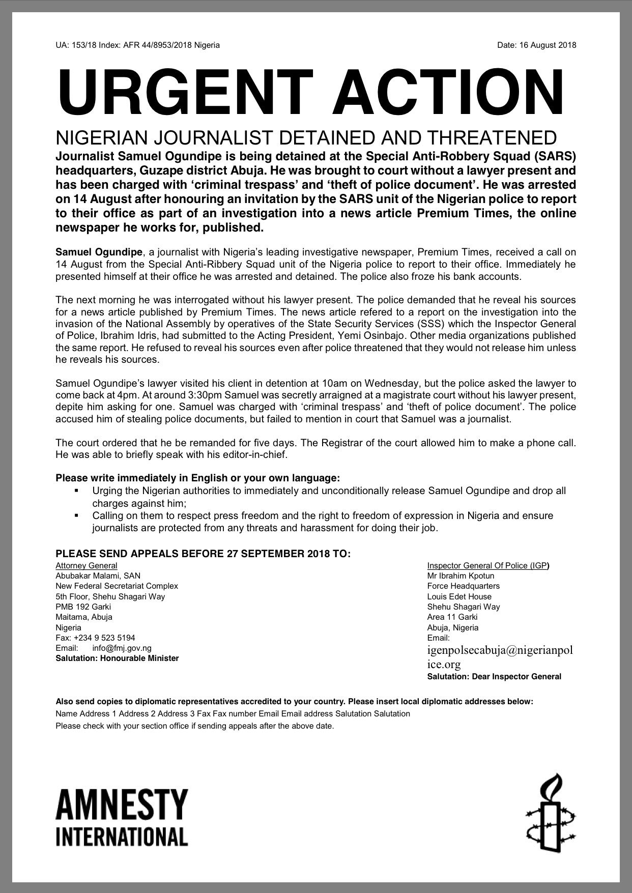 "We have launched an Urgent Action for the release of Samuel Ogundipe, Premium Times journalist arrested by Nigeria Police. You can also take action..!Journalism is not a crime. #FreeSamuelOgundipeNOW"