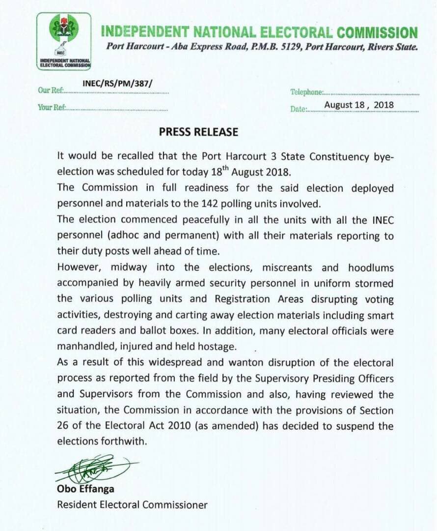 According to reports, the Independent National Electoral Commission, INEC, has suspended the Rivers State election rerun going-on today August 18th, citing widespread violence. However, sources on the ground and videos making rounds show members of the Nigerian police and SARS aiding APC thugs in snatching voting papers from various polling units.